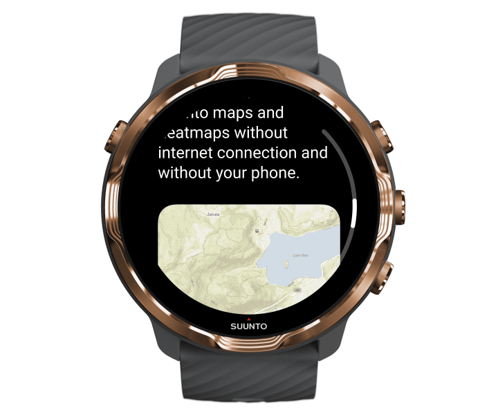 Descubre el mundo que te rodea usando los mapas gratuitos fuera de línea con datos del terreno, recorridos y líneas de contorno. Los mapas se consultan fácilmente en cualquier momento y solo tienes que hacer un sencillo gesto para echarles un vistazo mientras haces ejercicio. Los mapas térmicos integrados para 15 actividades como correr, natación y ciclismo te muestran las rutas más populares para que puedas entrenar donde lo hacen otras personas o abrir tu propio camino. Los mapas locales fuera de línea y los mapas térmicos se descargan automáticamente cuando te conectas a una red wifi y cargas el reloj.’ También puedes elegir de forma manual qué mapa quieres que se descargue. Gracias a los mapas fuera de línea siempre sabrás el camino y estarás informado de las mejores rutas de entrenamiento, incluso si te has dejado el teléfono o si no tienes conexión a la red.’’